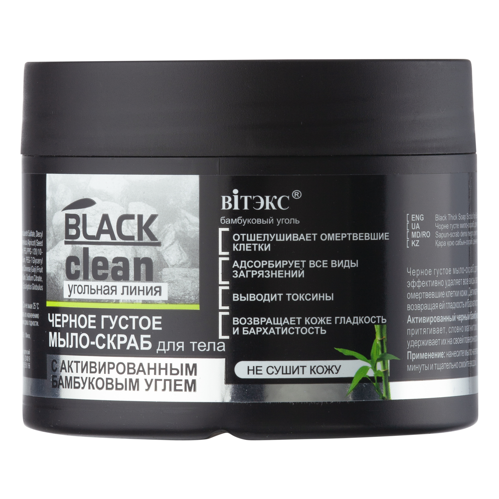 Thick black scrubbing soap with activated charcoal for body effectively absorbs all types of impurities gently exfoliating the dead skin cells. Gently cleanses the skin without drying it, returning smooth and velvety look to the skin.